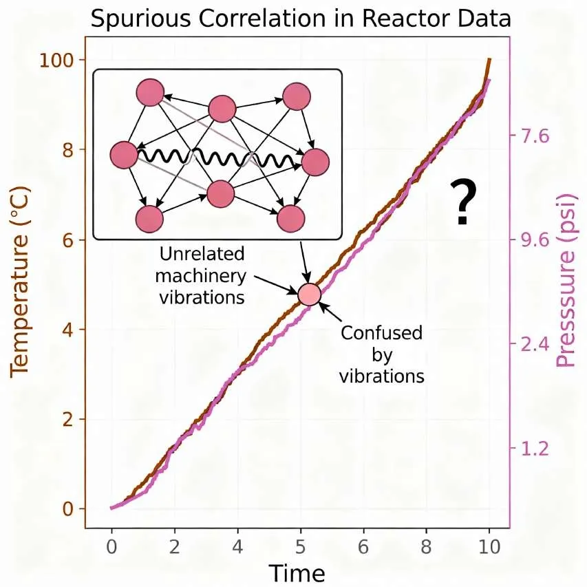 Time-series analysis is exceptionally good at identifying correlations within and between data streams. A model can easily learn that a rise in a reactor’s temperature is correlated with a rise in its internal pressure. However, the model has no inherent ability to distinguish this correlation from causation. It does not understand the Ideal Gas Law () that governs this relationship. This becomes problematic when the model encounters spurious correlations—coincidences in the data that are not linked by any physical mechanism. For example, a model might notice that a particular pump’s vibration increases whenever a nearby, unrelated production line is active. Without physical context, it might incorrectly conclude that the production line’s activity causes the vibration, leading to nonsensical maintenance recommendations.