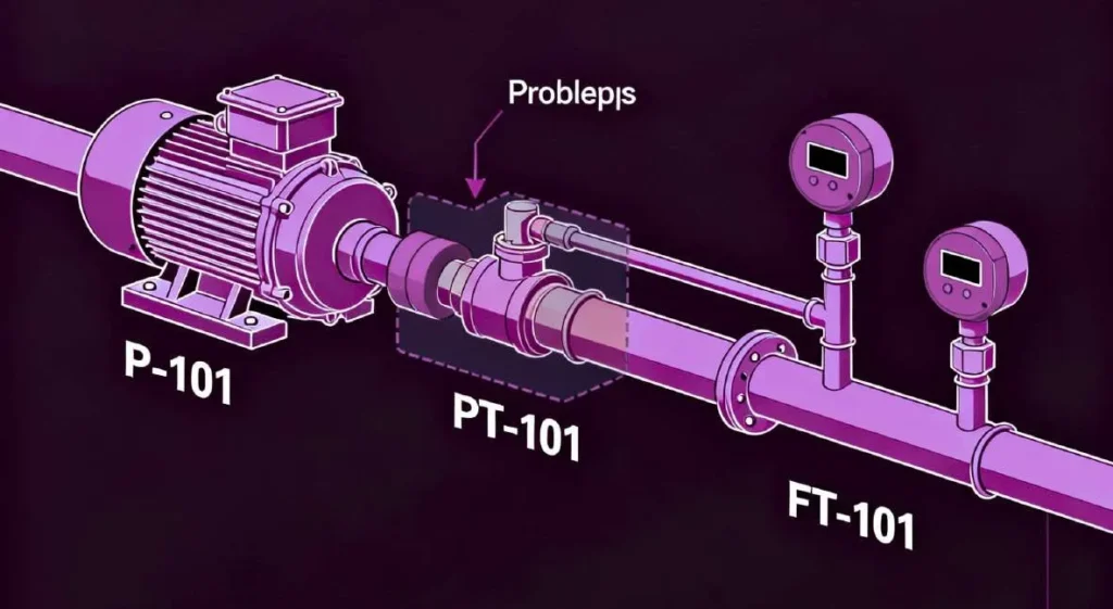- Action: The AI system queries its knowledge base for the tags PT-101 and FT-101. It retrieves the relevant P&ID sheet and parses the diagram to understand the system’s topology. It identifies that both instruments are located on the discharge line of pump P-101, which draws from a specific source tank and feeds a specific destination vessel. It confirms the piping layout, noting that there are no branches, bypasses, or alternative flow paths between the pump’s outlet and the location of the sensors.